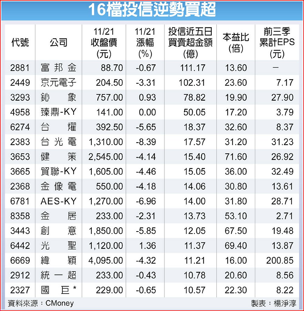 據CMoney統計,投信第三季賣超高達953.03億元、第四季以來迄今再持續賣超596.35億元。但若進一步檢視共同基金10月的持股資料,10月底仍保持在基金前十大持股中,且11月以來、近5日皆持續獲得投信買進的前16檔標的,依買超金額排序分別為富邦金、京元電子、鈊象、臻鼎-KY、台燿、台光電、健策、貿聯-KY、金像電、AES-KY、金居、創意、光聖、緯穎、統一超、國巨*等個股。