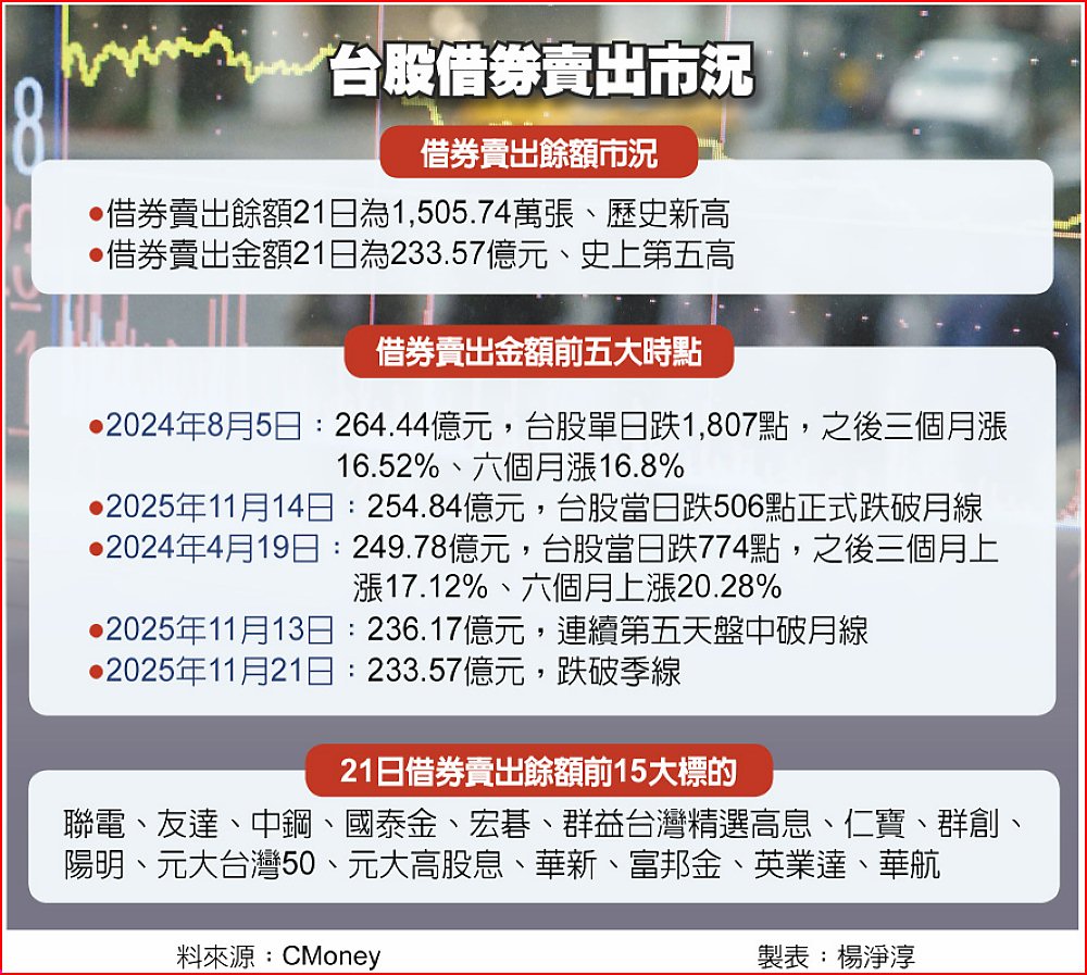 陳奕光指出,21日借券賣出金額高達233.57億元、為史上第五大;回顧前四次紀錄,皆出現在台股大幅重挫或跌破重要均線之際,但三至六個月後台股多數強勢反彈。例如史上最大量的2024年8月5日,台股當日暴跌1,807點,但三個月後反彈16.52%、六個月後漲幅達16.8%。