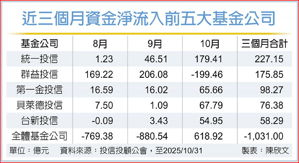根據投信投顧公會統計至10月底數據,統一投信近三個月資金流入227.15億元、群益投信近三個月規模逆勢增175.85億元、第一金投信增加98.27億元、貝萊德投信增加76.38億元、台新投信58.29億元,展現較強的吸金力道,主要與主動式基金與新基金募集有關。