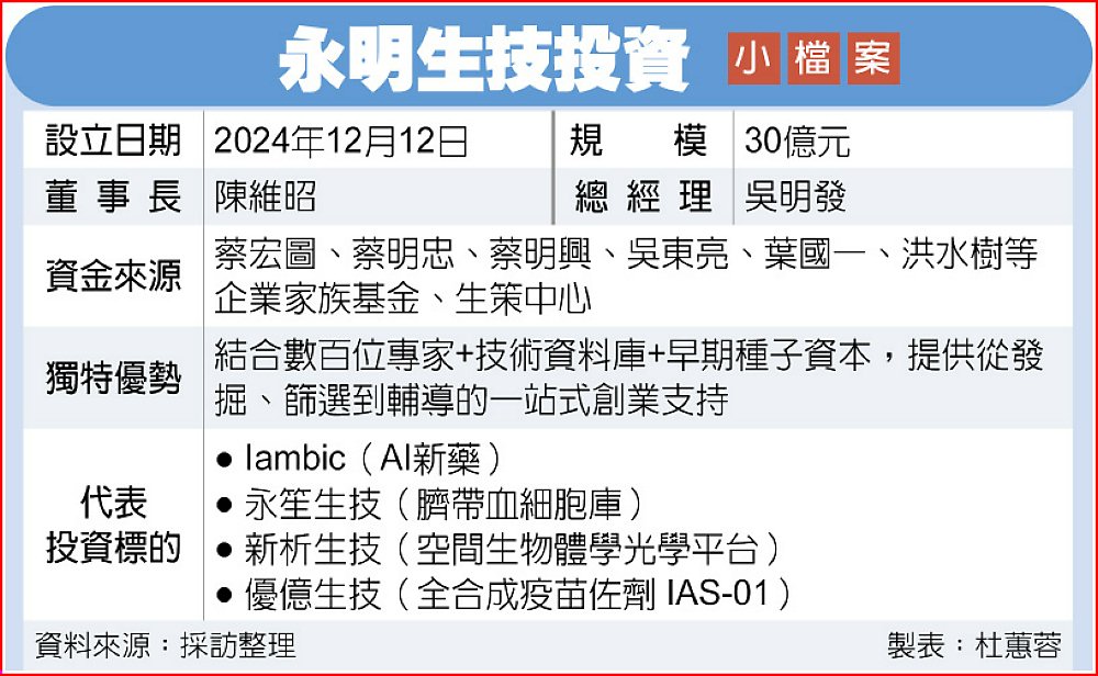 目前永明已完成四項具代表性的投資,涵蓋AI新藥、臍帶血幹細胞治療、光學平台、全合成疫苗佐劑等全球競爭力領域。其中最受關注的是永明投資的Iambic Therapeutics,該公司募資規模已超過百億元,投資陣容包括Nexus Ventures、Catalio Capital、Coatue Ventures、NVIDIA、Illumina Ventures、卡達主權基金等國際級資金。在最新一輪募資中,更吸引Abingworth、QIA、Ventures、ARK Venture Fund等全球投資者超額認購,永明則是唯一台灣投資人。