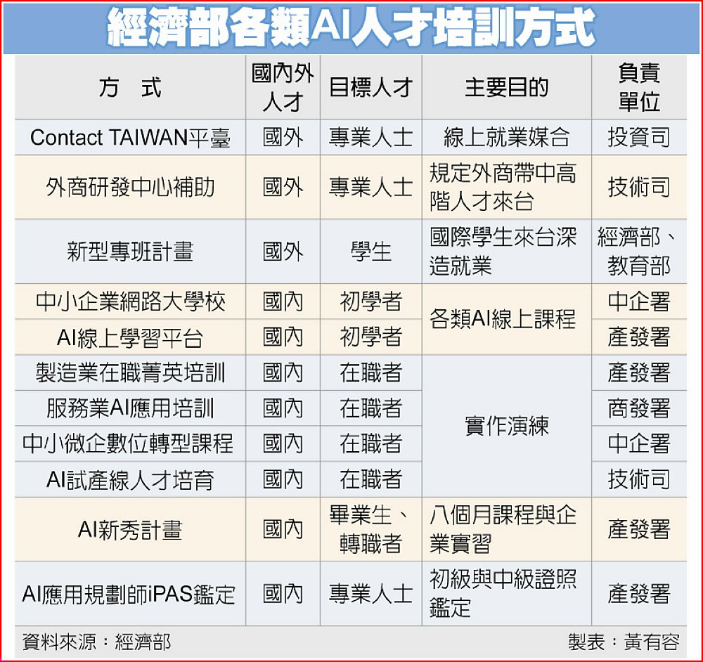 國內人才培訓方面,經濟部表示,對AI有興趣的初學者,可利用中企署「中小企業網路大學校」及產發署AI線上學習平台,學習各產業實務情境與AI基礎應用操作技巧,學習平台共已推出超過170門線上課程。而在職員工培訓又分為不同產業領域:產發署主要推動製造業在職菁英培訓,有政府辦理培訓及企業自辦訓練等模式,兼具實作演練;商發署針對服務業的熱門職類,規劃客戶服務、行銷業務、產品企劃等六大領域AI應用培訓課程;中企署補助中小微企業員工參與數位轉型或AI相關課程;技術司則推動AI試產線人才培育。