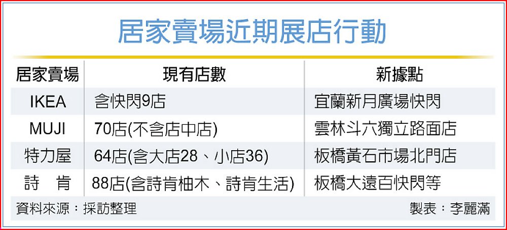 房市低迷,對於居家產業也造成不小衝擊,且居家的剛性需求亦因近期匯率、關稅等因素,導致消費更趨保守,居家賣場為拓展業績新藍海,紛紛從都會區往三、四線城市展店卡位,搶攻在地鄉親「心」占率,包括IKEA快閃宜蘭試水溫,MUJI進駐雲林首開街邊店,詩肯快閃各地百貨量販商場,特力屋則加速擴展社區店。