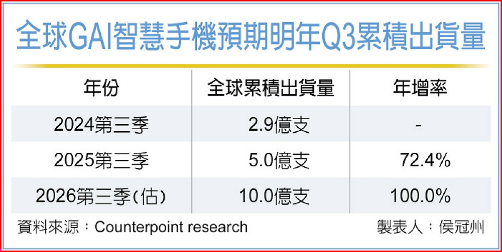 Counterpoint預期,在品牌業者加速布局及消費者接受度提高之下,到2026年第三季,具備生成式AI功能的智慧型手機累積出貨量將突破10億支,這項成長加速主要受惠於中階機種開始採用進階AI晶片,以及輕量化裝置端AI模型快速普及。