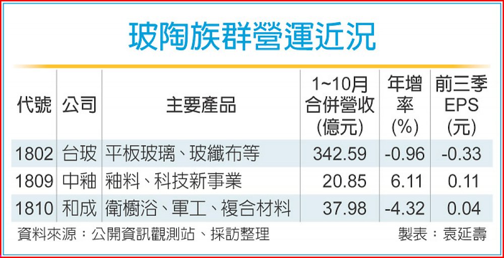 玻陶族群搶搭AI順風車。受惠於AI運算與高階應用持續升溫,伺服器與雲端運算需求全面爆發,市場對Low CTE(低熱膨脹係數)玻纖布需求增加,國內玻璃龍頭台玻(1802)因具有Low CTE玻纖布生產能力並已獲客戶認證採用,近期受市場關注程度破表;中釉(1809)、和成(1810)也因開發新材料與AI關聯度最高的半導體沾上邊,營運成長受市場期待。