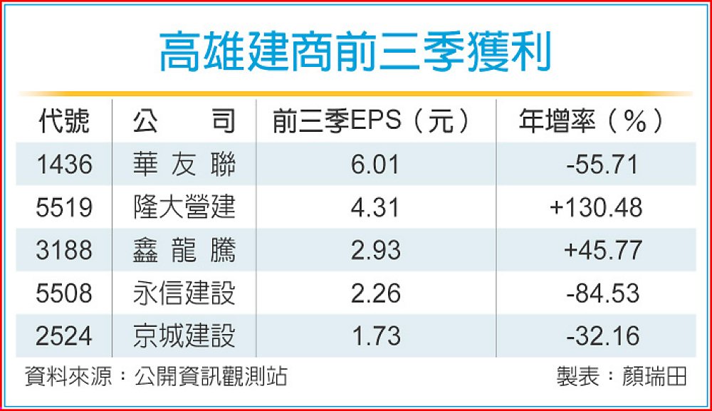 面對房市逆風,高雄上市櫃建商仍有5家在前三季繳出獲利的成績單,華友聯(1436)、隆大(5519)、鑫龍騰(3188)躍居EPS前三強,今年以成屋銷售為主的永信建(5508)與京城(2524),前三季EPS也分別有2.26和1.73元的表現。由於房市在年底之前,未見轉好跡象,今年高雄建商獲利排名大致已定。