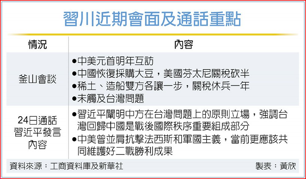 新華社昨晚報導,習近平於11月24日晚間,與美國總統川普通電話。這是繼10月30日在韓國釜山舉行習川會之後,川普和習近平事隔不到一個月再次對話。由於釜山「習川會」雙方未如預期談談論台海議題,而在日相高市早苗本月初有關「台海有事」的談話引發中日關係緊張,此時習近平向川普傳達中國對台立場,格外受到關注。
