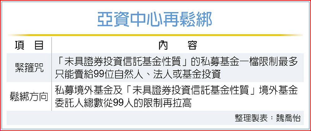 金管會為力拚台灣成為「亞洲資產管理中心」,目前正研議鬆綁「私募基金、未具證境外基金委託總數不得超過99人」的規定。金管會透露,「未具證投信性質」的私募基金人數鬆綁不用修法,只要修改函令就可以,速度會比較快,年底前有望鬆綁99人限制,但業界希望的「全無人數限制」不太可行,還是會有人數限制,但門檻會拉高。