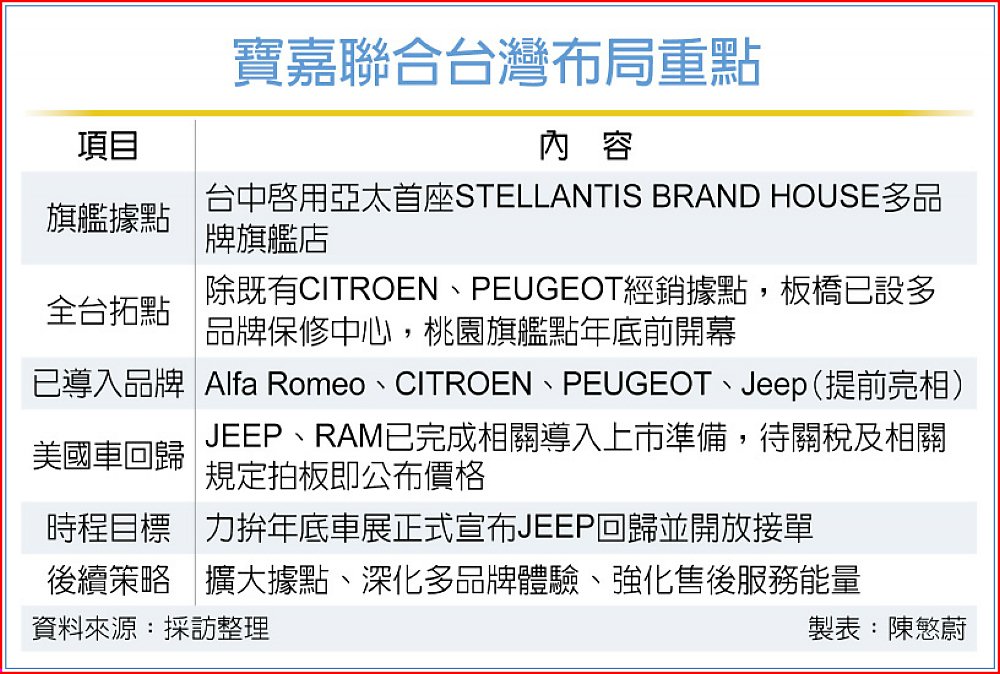 寶嘉聯合執行董事吳睿弘預告,只待對美關稅確立就可接單,JEEP有望在年底台北車展正式上市,成為首波回歸台灣的美國汽車品牌。他說,包括JEEP、RAM等集團內的美系品牌車導入規劃早已全部就緒,「不同稅率下的車價我們都已算好,公布關稅後24小時內就能正式宣布價格。」