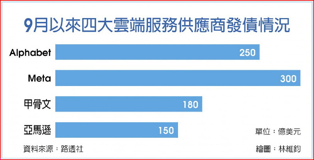 今年9月以來,亞馬遜、Alphabet、Meta與甲骨文等AI基建投資大戶陸續湧入債市,合計發行約880億美元投資級債券,超出過去3年半的總和。新創AI資料中心營運商TeraWulf與Cipher Mining也在投機級債市募資超過70億美元,形成前所未見的AI債券洪流。
