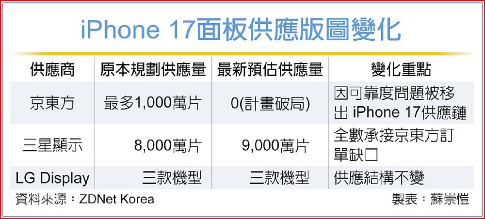反觀京東方,此次失利將直接衝擊其年度出貨表現。原先預期2025年對蘋果(包含iPhone 17及舊機型)的OLED面板總出貨量可達4,000多萬片,如今恐將跌落至4,000萬片以下。