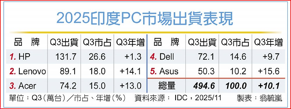 至於排名印度PC第五大的華碩,除在消費PC領域衝上市占第二外,在印度商用PC市場也靠著拿下SMB的訂單,進一步挹注其單季在印度市場出貨量站上50萬台,年增15.6%。