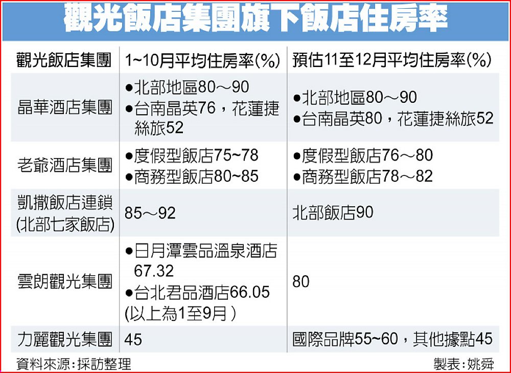 受惠大型展會與獎勵團增加,觀光飯店集團旗下北部商務飯店前十月平均住房率衝高至80%~90%;休閒度假旅館因颱風地震衝擊,加上出境旅遊市場成長影響國旅,導致今年住房率表現普遍不如預期,11、12月寄望「普發現金萬元」與「平日國旅最高三天兩夜補助2,000元」推升住房率。