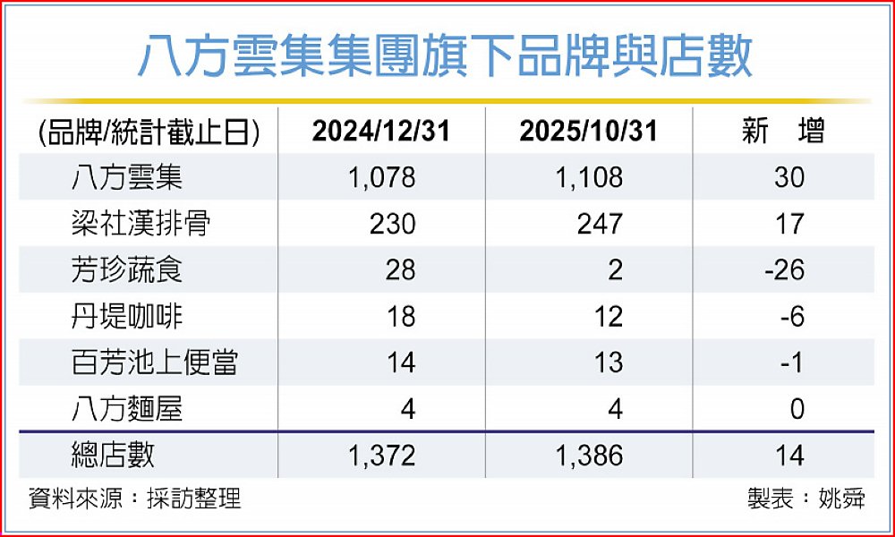 八方雲集集團旗下餐飲品牌有八方雲集、梁社漢排骨、芳珍蔬食、丹堤咖啡、百芳池上便當、八方麵屋,截至今年10月底,全球總店數達1,386家,較2024年增14家,其中台灣1,296家、香港78家、美國12家。