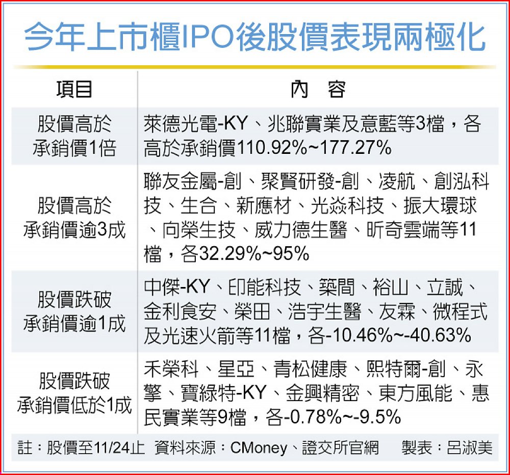 從上市櫃IPO後股價表現來看,今年愈早掛牌股,股價愈可享受蜜月期,愈後面跌破的機率相對高;此外,上櫃股及上市的創新板股,股價飆得更強悍,多數仍維持在承銷價之上。