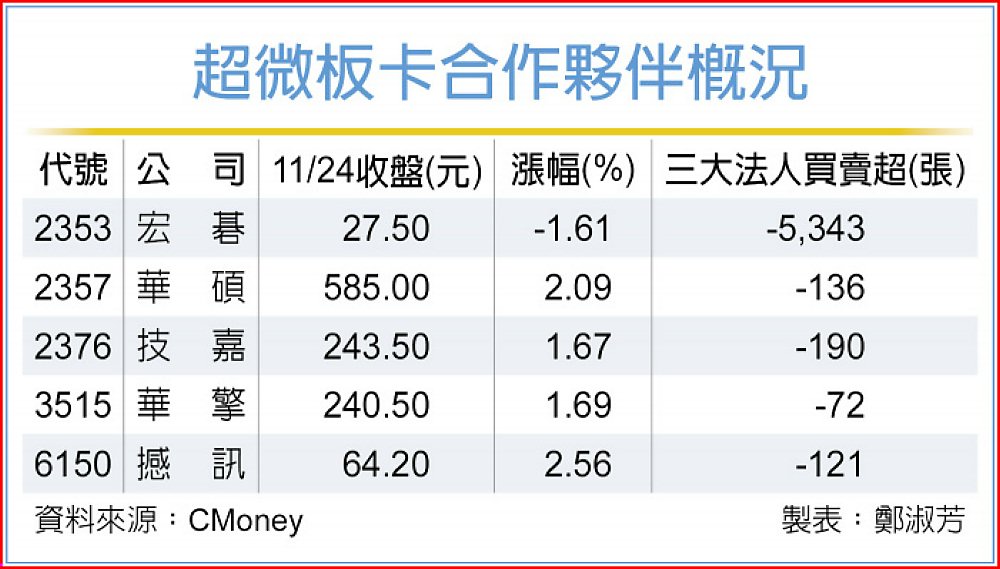 受到漲價消息面牽動,超微顯卡供應商包含華碩、技嘉、撼訊、華擎與宏碁昨日均反映利多,股價全面起漲,其中尤以撼訊漲幅最大,早盤一度衝高至67.5元,漲幅達7.83%,其他包括華碩、技嘉、華擎亦曾拉出逾3%的漲幅,雖然終場因台股收歛漲幅而漲勢受阻,但華碩、技嘉、撼訊、華擎仍保有逾1.5%的漲幅,僅宏碁尾盤急殺,不但由紅翻黑,跌幅還擴大至1.61%,收在全日的最低點。