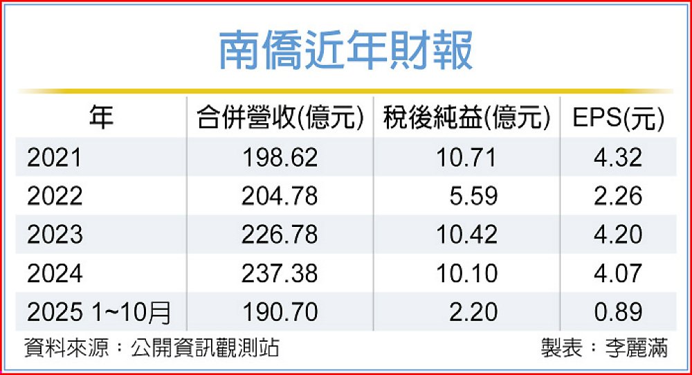南僑今年前三季營收172.6億元、年減1.08%,毛利率25%,稅後純益2.08億元、年減73%,每股稅後純益(EPS)為0.84元。南僑表示,獲利衰退係受中國內捲競爭,加上中國原物料成本大漲所致。