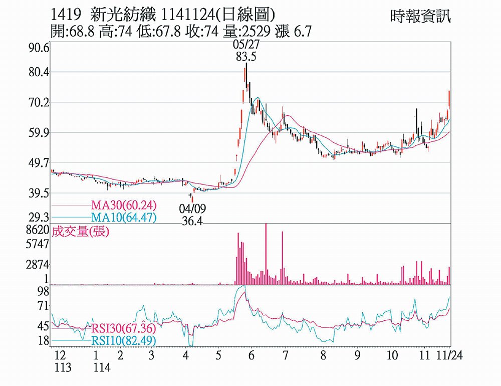 新紡(1419)受惠於北市府與新壽正式解約,輝達確定進駐北士科消息,吸引短線買盤投入,24日股價在量能較前一日放大3倍下急拉,收漲停價74元,為近六個月以來新高,已站穩所有短均線之上,周、月、季線趨勢維持上揚,各短線技術指標仍有利多頭。惟今年高點80元之上套牢籌碼浮額多,短期股價要衝高仍需量能持續放大。
