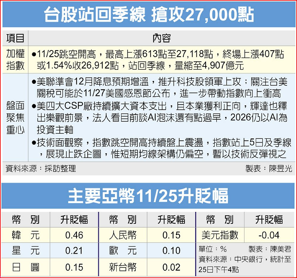 法人指出,AI泡沫論及美降息延後,台股回測季線,有利空鈍化跡象,後續因短期均線下彎,震盪整理機率較高,年底前仍有上攻空間,指數區間約落27,500點到28,000點間,惟融資餘額25日大增49.88億元,較前一日增26.72億元多出23.16億元,需留意散戶恐造成籌碼凌亂。