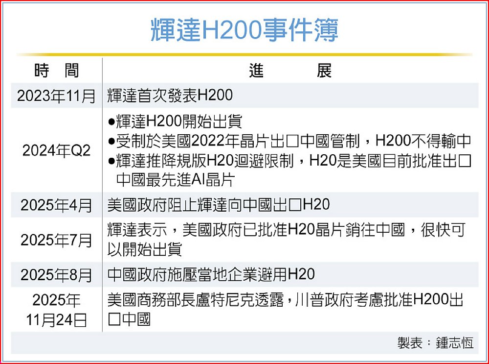 上周已傳出川普政府官員正討論批准H200出口中國的可能性。輝達兩年前推出H200,較前一代H100能搭配更高容量的高頻寬記憶體(HBM),使運算資料速度更快。
