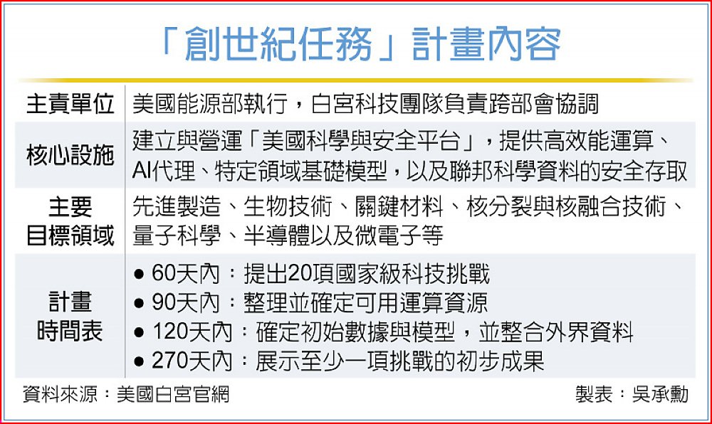 官網上也詳細列出任務時刻表,說明該任務需要推進的進度。如能源部須在60天內提出至少20項重大科技挑戰,90天內要整理並確定可用運算資源;120天內則是要確定初始數據與模型,並整合外界資料;到了第270天,則需要展示至少一項挑戰的初步成果。