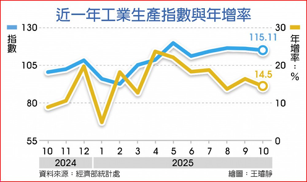 AI、高效能運算及雲端資料服務等應用需求持續暢旺,工業生產指數、製造業生產指數10月為115.11、116.03,皆創歷年同月新高,寫連20紅。經濟部統計處指出,若今年11、12月製造業生產指數平均到達110.39,則全年指數可達到年增15%,挑戰機會很大。