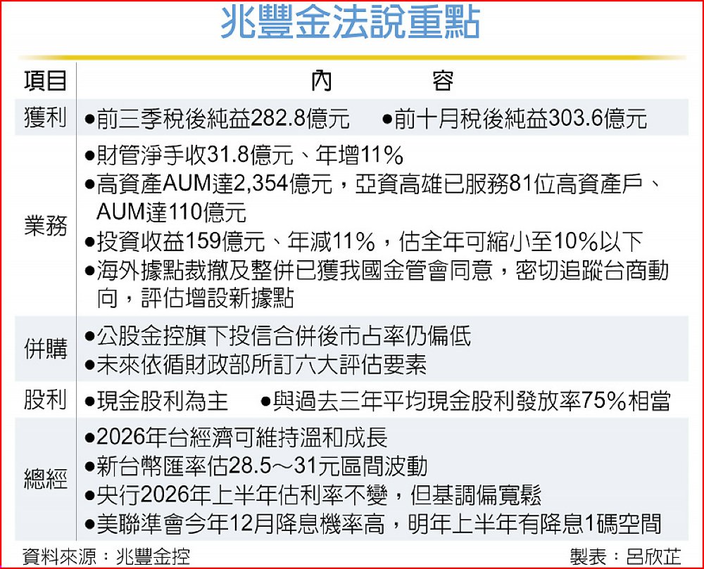 兆豐金前三季稅後純益282.85億元,每股稅後純益(EPS)1.91元,主要子公司兆豐銀行稅後純益234億元。張傳章指出,兆豐金去年呆帳費用較高,今年資產品質維持穩健,預期信用成本將較去年下降,加上各子公司獲利穩定,集團全年獲利可期。