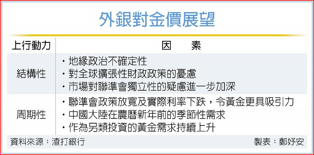 黃金近期反彈,評價面是否偏高,引發討論。外銀表示,黃金的長期動力依然存在,主要是因為多元化需求強勁,研判未來6個月~12個月的周期性動力有三,一是美聯準會政策放寬及實際利率下跌,令黃金更為具吸引力;二是中國大陸在農曆年前季節性需求;三是作為另類投資的黃金需求持續上升。
