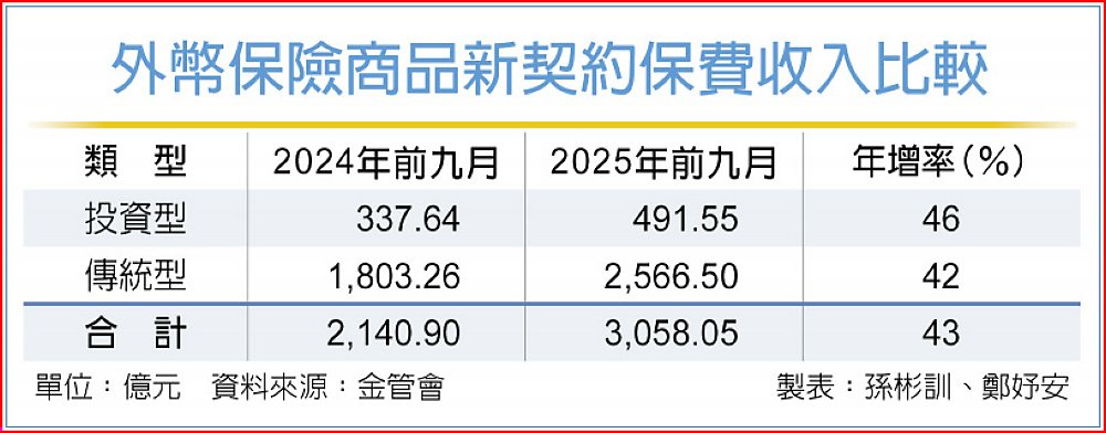 整體來看,前九月外幣保險新契約保費收入年增917.15億元、年增率約43%,全年外幣保單新契約保費收入上看4,000億元。
