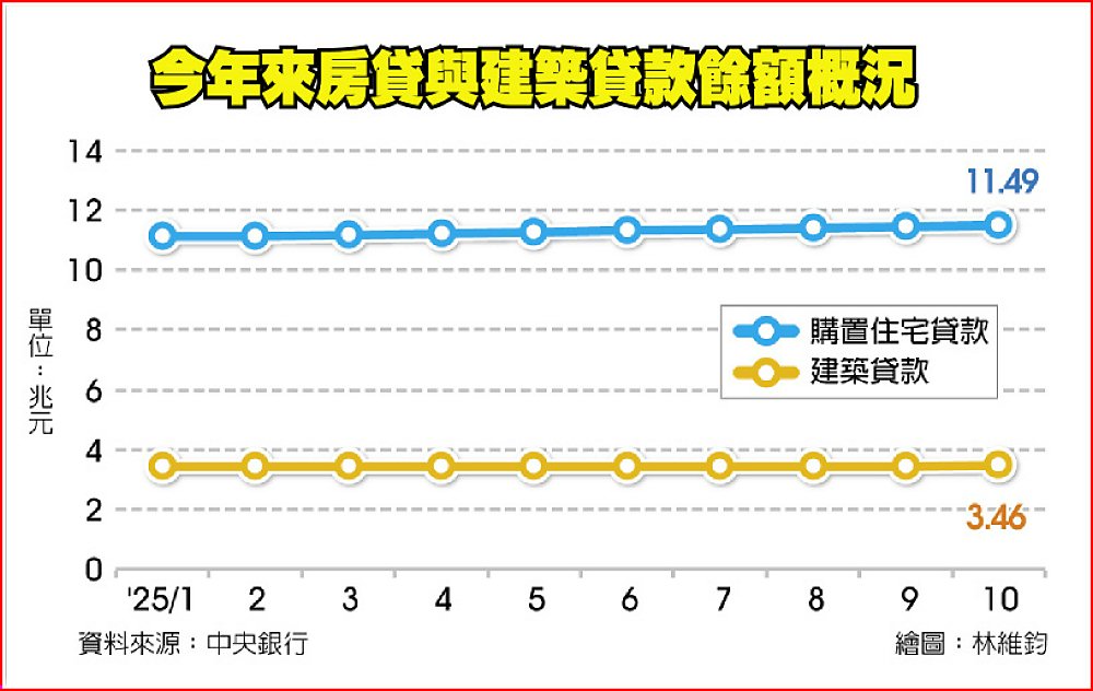 央行25日公布10月房貸與建築貸款餘額。除房貸餘額增速維持放緩趨勢外,建商推案信心指標的建築融資餘額來到3兆4,599億元,月增288億元,由前一個月的年減0.37%,轉為年增0.01%。