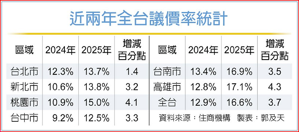 根據統計,去年新北、桃園、台中平均議價率約9%~11%,台北、台南、高雄則在12%~13%,經過近一年來房市交易量急縮,即使開價未見下修,但議價空間明顯擴大,雙北及台中議價率約12%~14%,桃園達15%,台南、高雄更達17%。