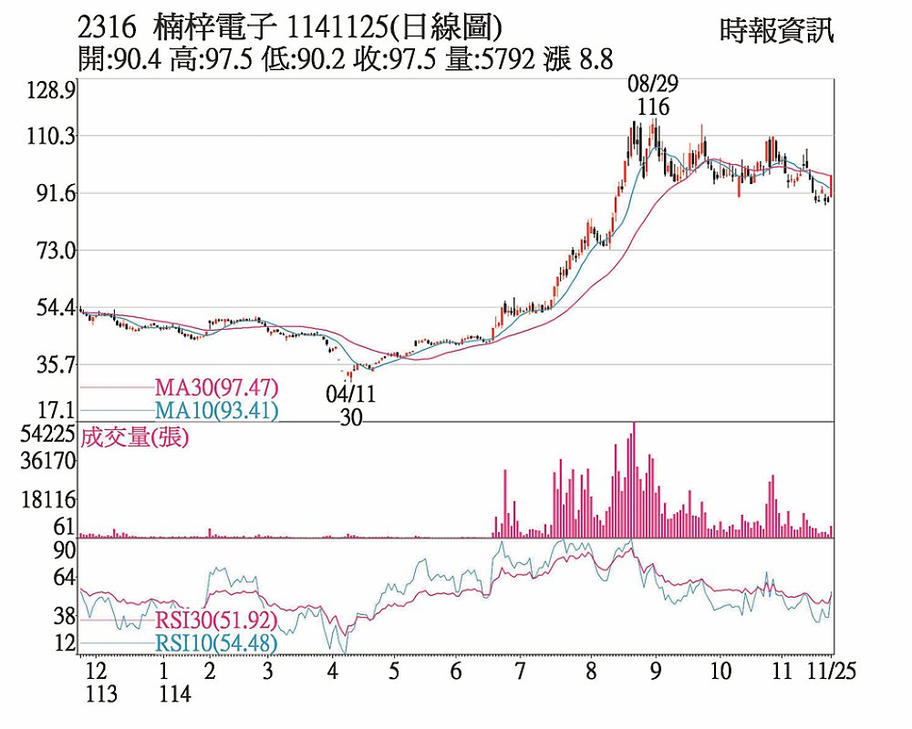 楠梓電(2316)25日以90.4元開出後,一路推升至97.5元鎖住漲停並作收,上漲8.8元,收復5日、10日等短期均線,委買排隊張數高掛2,181張,成交量則達5,715張,目前技術指標日KD已自低檔交叉向上,有利後市走勢。