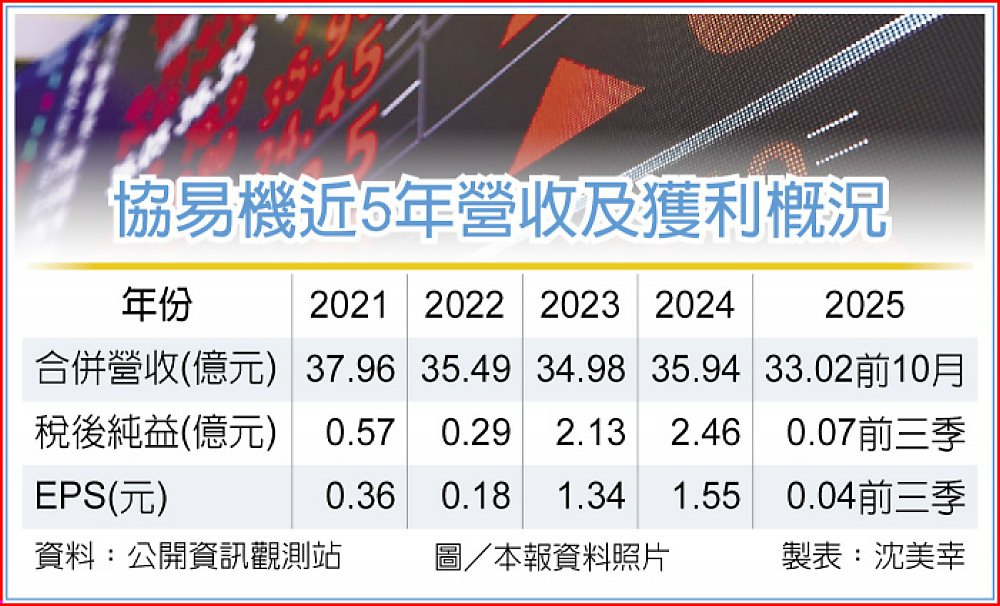 沖床大廠協易機(4533)對2026年營運審慎樂觀,目標是營收及獲利挑戰新高,成長動能除既有的汽車基礎,AI伺服器、航太及氫能源等產業繼續成長。關稅及匯率對今年營運影響已在第二、三季充分表現,目前利空出盡,前三季EPS為0.04元,全年努力拚獲利。