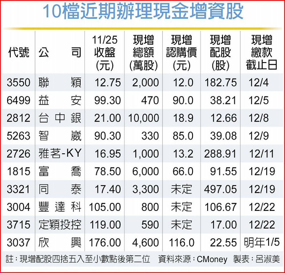 ABF股欣興等仍有可觀套利空間,25日收176元、每股現增價格116元,估計潛在套利空間超過51%,極具有吸引力,預計12月5日至明年1月5日繳款。