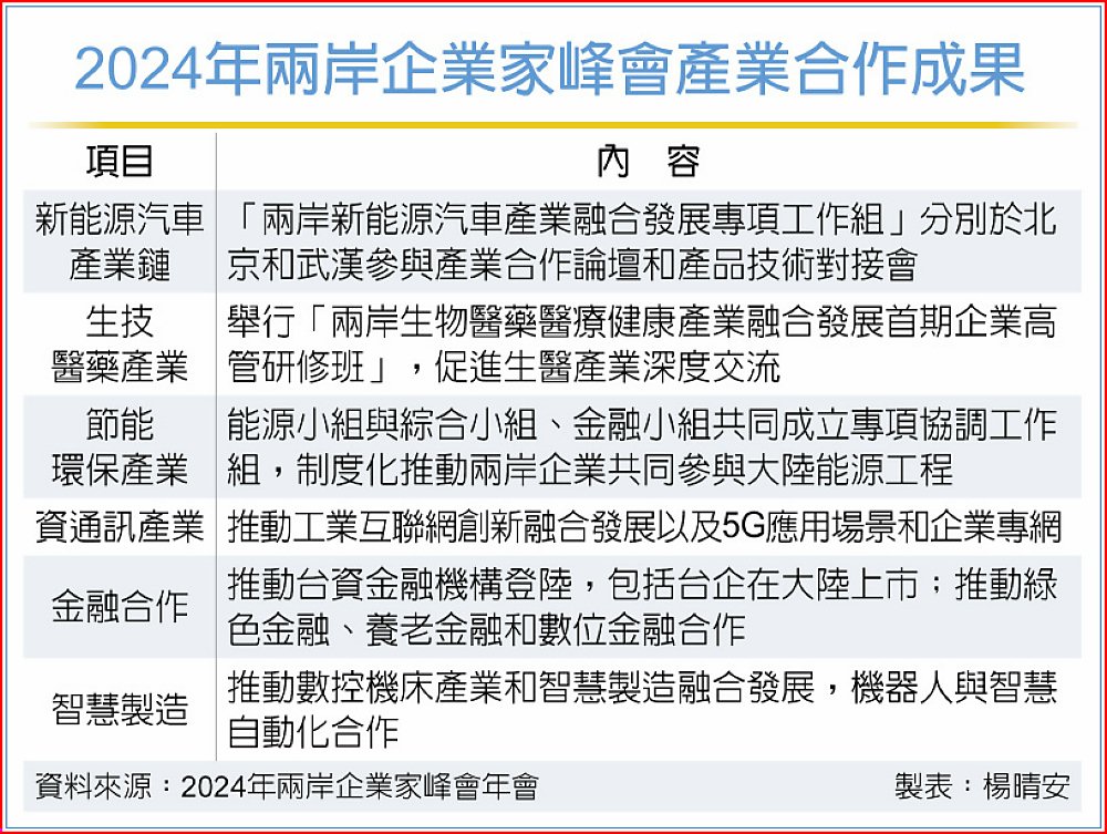 「兩岸企業家峰會」做為兩岸最重要的大型企業交流平台,於2013年7月分別在台北和北京正式成立,並設有資訊通信、能源及環保節能、金融、中小企業合作暨青年創業、智能製造及裝備等8個產業合作推動小組。在當前兩岸官方互動處在寒冬之際,持續密切交流,推動兩岸各項產業合作。