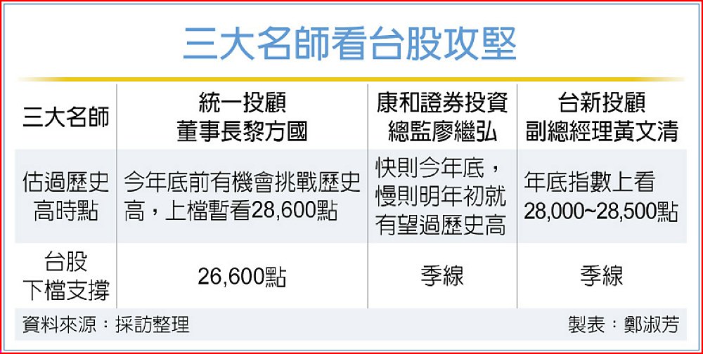 台新投信副總經理黃文清表示,季線已獲完全支撐,題材股呈良性互動,近期軍工股、矽光子、Google概念股輪番登場,沈寂已久的傳產股,如水泥、散裝航運也成功點火,年底前指數上攻至28,000~28,500點機率頗高。