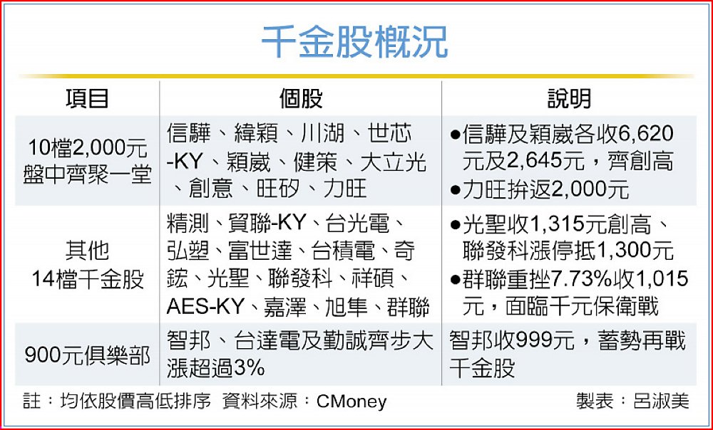 據統計,24檔千金股中,信驊、穎崴及光聖等3檔收歷史新高,力旺功敗垂成未站穩2,000元,以1,975元下跌15元作收,智邦收999元,重返千金股僅一步之遙,預期27日可望分別再戰2,000元及1,000元大關。智邦獲外資力挺,連3日敲進1,008張。