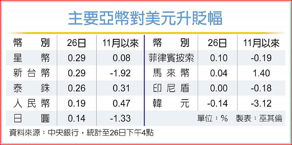 新台幣26日盤中最高31.313元,終場收在31.35元,為11月21日以來近一周高點,升值9分,已連續二個交易日收高,總成交量略縮為16.87億美元。