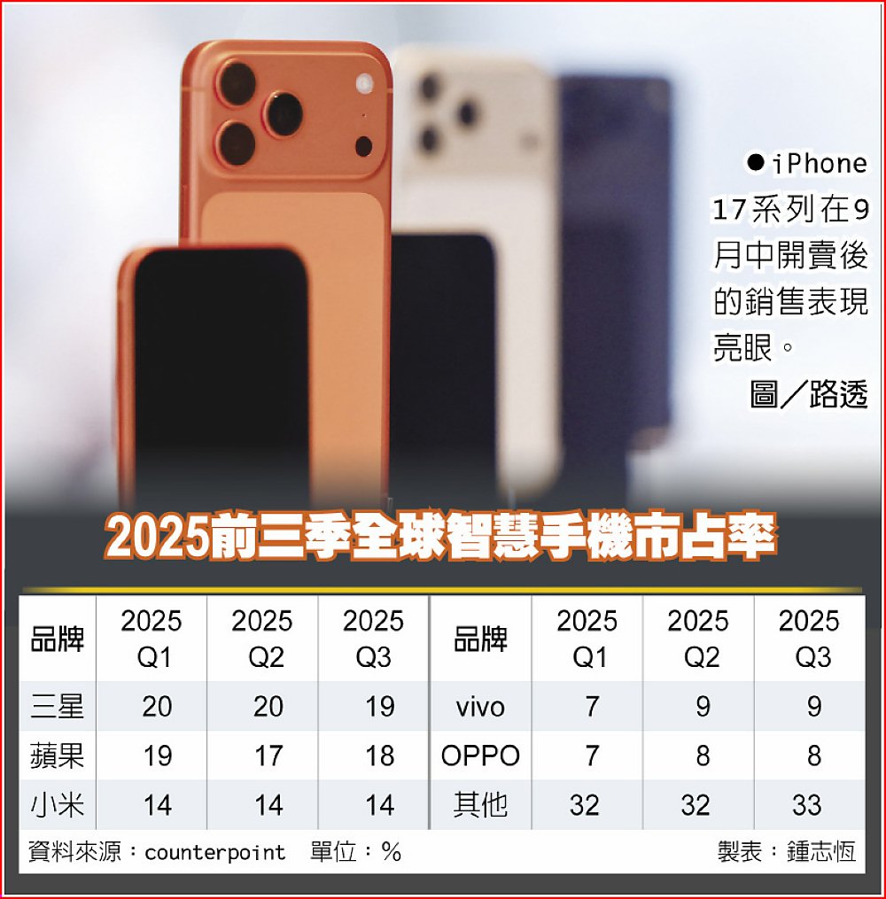 雖然今年前三季,蘋果市占率都略低三星電子,但Counterpoint以iPhone 17系列銷售表現強勁為由,看好蘋果第四季將會反超前並奪回龍頭寶座。