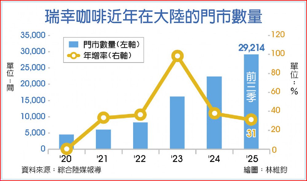 瑞幸咖啡自2017年創立以來,採取數位化營運、快速展店、低價、補貼等方式,積極搶攻大陸市場。儘管瑞幸經歷2020年財務造假風暴,從美國那斯達克退市,但經過重新整頓,如今不僅在大陸市場站穩腳步,更在門市數量與營收規模上「雙殺」曾在大陸咖啡市場長期稱霸的星巴克中國。據統計,截至2025年第三季,瑞幸的大陸門市總數至已逾2.9萬家,遠超過星巴克中國的7,700家。這意味著瑞幸在門市覆蓋率與可觸及性上,已大幅領先星巴克中國。