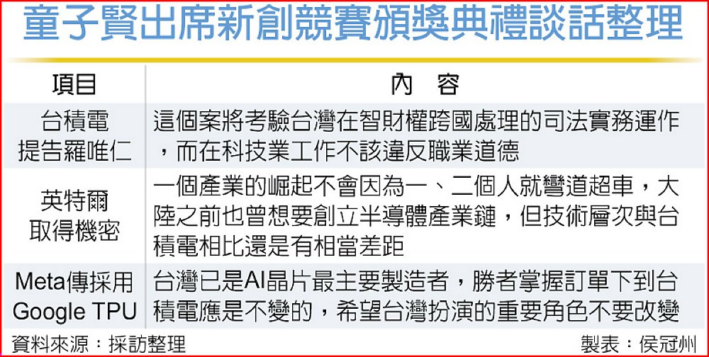 經濟部中小及新創企業署26日舉辦「2025科技新創競賽頒獎典禮暨展示交流活動」,童子賢以台北市電腦公會榮譽理事長身分出席,接受媒體聯訪時回應台積電提告羅唯仁、Meta傳採用Google自研TPU等議題。