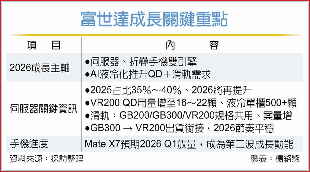 軸承廠富世達(6805)26日舉行法說會,財務長邱稚育表示,伺服器與折疊手機將是未來兩年成長主軸,AI伺服器平台邁向高瓦數與液冷化,帶動快接頭(QD)與滑軌需求同步升溫,2026年相關業務占比可望再提升,整體毛利率亦有進一步改善空間;折疊手機方面,新款旗艦機已開始增量,預計2026年第一季放量,成為明年第二波成長動能。