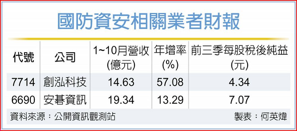 創泓科技及安碁資訊第三季業績表現亮眼。創泓科技第三季營收4.6億元、年增57.5%,稅後純益0.37億元、年增106.7%,前三季每股稅後純益4.34元,遠優於去年同期的2.69元。安碁資訊第三季營收6.26億元創新高,累計前三季營收17.4億元、年增12.8%。
