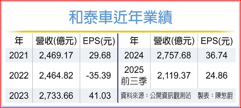 展望2026年車市,和泰車看法正向。今年整體車市買氣尚未全面回升,但和泰車受惠旗下雙品牌銷售穩健,本業獲利成長,推升第三季稅後純益達55.83億元、年增30.44%,EPS達10.03元,獲利創近五季新高;累計前三季稅後純益138.47億元,雖年減13.7%,EPS為24.86元,但仍為同期第三高。