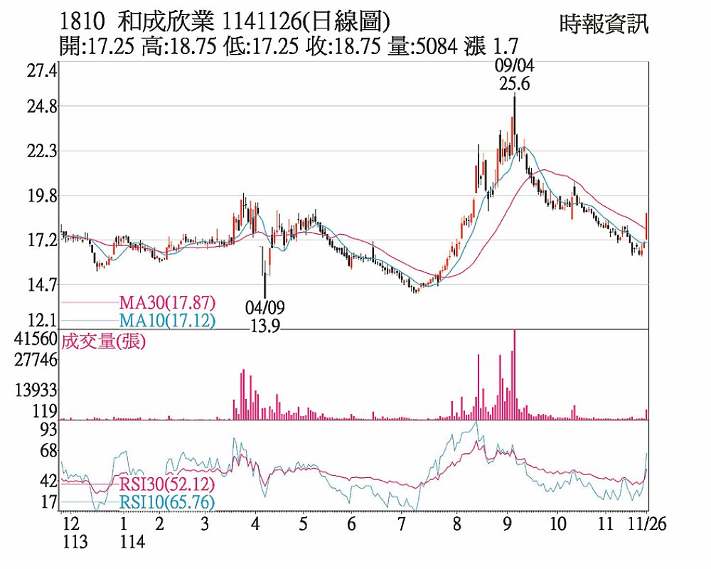 和成(1810)受益於政府拋1.25兆元國防大單,軍工概念股成市場短多搶進標的,26日開高放量收盤漲停18.75元,重新站上所有短均線之上,短期5日均線已反轉上揚,月線及季線趨勢也開始走高,9日KD值趨線也在低檔黃金交叉走高,各短線技術指標多呈多頭排列。量能若能持續放大突破前波高點19.5元,可望向20元整數關卡挑戰。