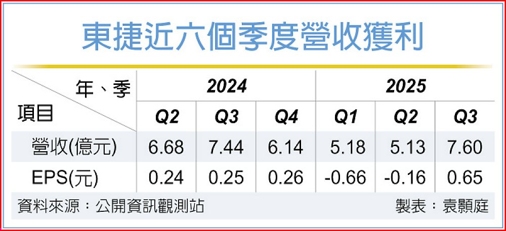 東捷今年前三季合併營收17.91億元,年減10%,營業利益1,400萬元,年減34.3%,稅後淨損約2,600萬元,每股淨損約0.16元。東捷第三季單季已轉虧為盈,每股稅後純益0.65元,由於營收認列集中下半年,第四季是營收認列高峰,預期將帶動全年轉虧為盈。