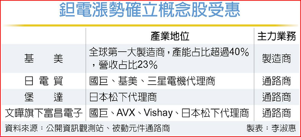 全球鉭質電容供應商呈現寡占的情況,前三大廠均為美商,包括基美、AVX以及Vishay,合計市占率將近60~70%,國巨旗下的基美為鉭質電容龍頭,全球產能占比超過40%,於國巨的營收比重約23%,為國巨旗下第二大產品線,僅次於磁性元件的27.6%。