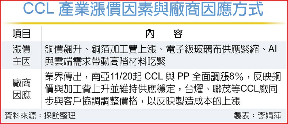 隨著銅價上漲,業界近日傳出,南亞率先啟動調價,通知客戶因LME銅價大幅走高、銅箔加工費持續增加,加上電子級玻璃布供應緊縮,自11月20日交運日起,CCL全產品線一律調漲8%,PP產品亦同步調漲8%。