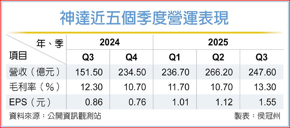 AI伺服器需求強勁及星際之門專案挹注,神達今年營運表現亮眼,第三季營收247.62億元,稅後純益20.59億元,季增38.5%、年增近八成,EPS 1.55元;前三季營收750.51億元,已超越去年全年,稅後純益48.89億元,EPS為3.68元。