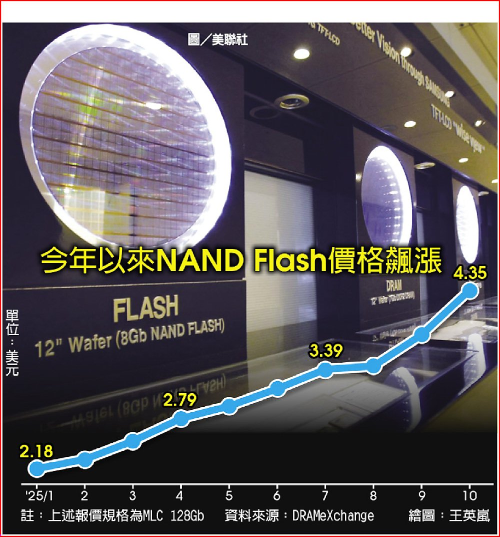 DRAMeXchange資料顯示,用於記憶卡與USB的NAND Flash記憶體以MLC 128Gb規格為例,固定交易價格在10月月增15%至4.35美元,是2015年以來最大漲幅。若與今年1月固定交易價格2.18美元相比,價格已經翻倍。