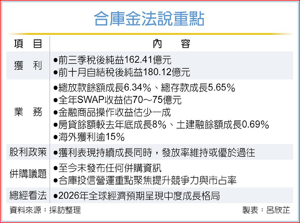 合庫金控27日舉行法人說明會,今年截至9月稅後純益162.41億元,年增0.09%,每股稅後純益(EPS)1.03元,前十月自結稅後純益180.12億元、年增2.35%。法人關注焦點集中在股利政策上,合庫金總經理蘇佐政強調,將會在獲利表現持續成長同時,維持或優於過往股利發放率。